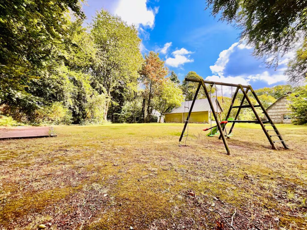 À l’extérieur, une terrasse privée permet de profiter pleinement du cadre naturel. Le parc arboré, partagé avec d’autres équipements de loisirs, offre de beaux espaces pour jouer, se détendre ou simplement apprécier le calme environnant. Les familles apprécieront particulièrement les équipements extérieurs et les aménagements adaptés aux enfants.